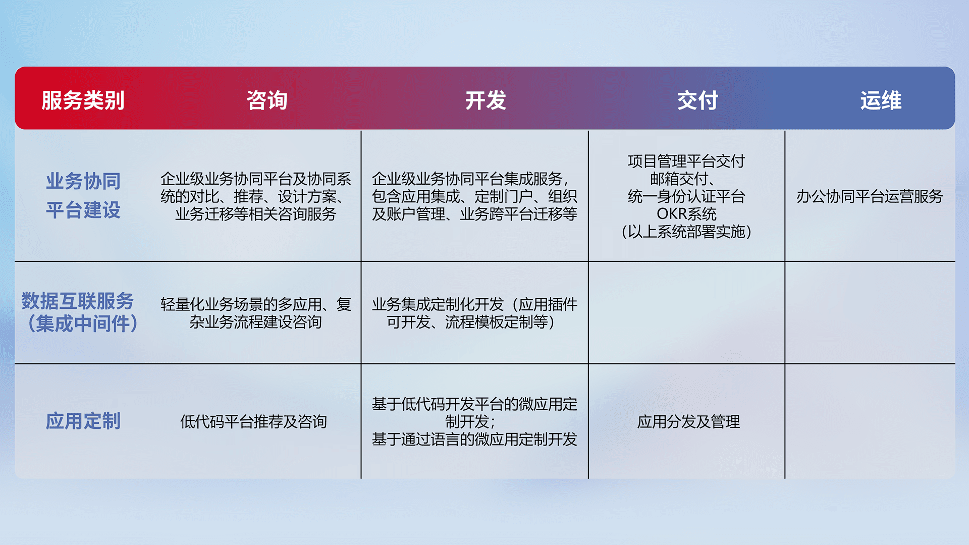 针对钉钉、、、、企微、、、、IDaas等平台级产品提供产品的规划、、、方案、、、交付、、、定制化开发等服务,,,,实现如统一协同办公、、智能客户服务、、、混合会议管理、、智能数据查询、、、、等业务场景,,实现数字化转型。。。。